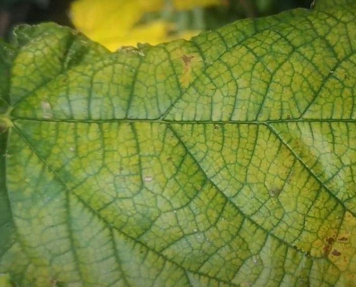 Iron deficiency also causes inter venial chlorosis. Unlike magnesium however the plant cannot triplicate iron therefore young leaves will show signs of deficiency before older ones. A possibility of tapping iron is dependent on the ph of the soil.